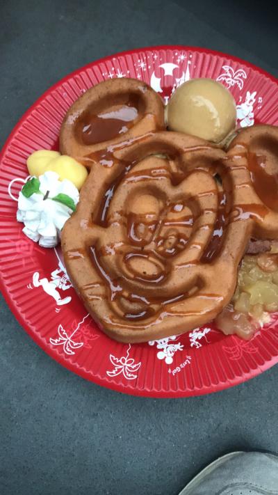 外はカリッ中はフワフワのミッキー型のワッフルが買えます。紙皿での提供なので、パレードルートで食べたり少し離れたベンチで食べることもできます。朝ごはんにする人も多いためオープンからいつも行列です。定番の他に季節ごとに変わるメニューもあります。
