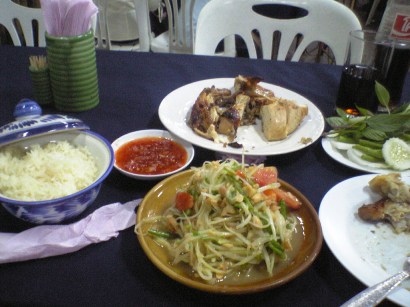 ガイヤーンは半羽ぶんといっても7~8切れはあり、大人二人ぶんくらいなのでしょうがあまりの美味しさに一人で完食、腹に詰めたにんにくの風味と皮に塗ってある甘辛いたれの風味が合わさって手が止まりません。スイートチリソースをベースにしたたれがついてきますが、なくてもいいくらい。ソムタムの量もかなり多いです。それほど辛くないですが、青唐辛子ががんがん入っているのでご注意を。- 旅行時期