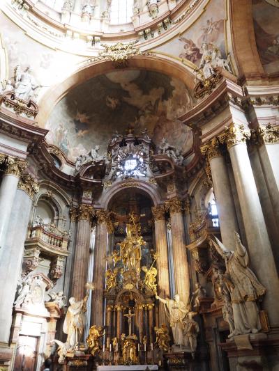 ペーター教会はバロック様式で建築され、外観はこじんまりとしたかわいらしい印象ですが、教会内部は豪華な装飾と天井一面に描かれたフレスコ画が大変美しいです。