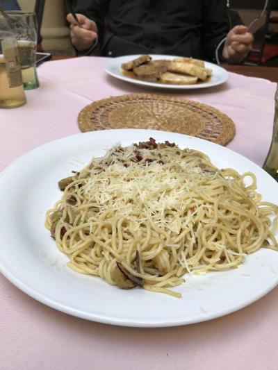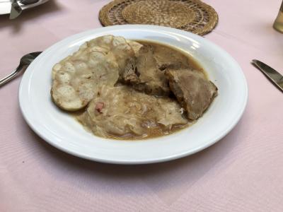 お料理はパスタとチェコ料理のクネドリーキという豚肉のローストを頂きました。