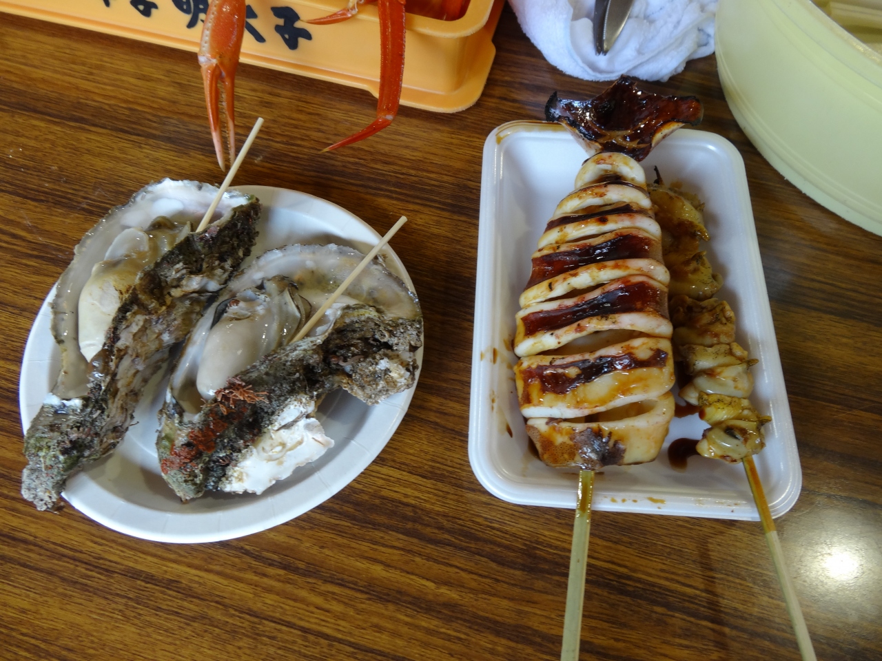 あとは、他のお店でイカ、ツブ貝、岩牡蠣の焼き物を買ってカニ館へ。