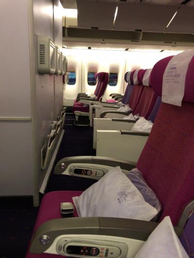 タイ航空は色合いが可愛いすぎる。真ん中の席は空いてたのでホッ。