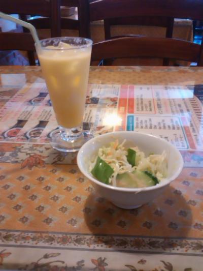 サラダ、ドリンク、エビ、ナン、ライス付き。+100円でチーズナンにしました。