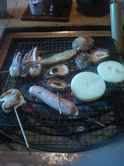 くしに刺された海産物や野菜を各自取ってきてテーブルで焼いて食べました。