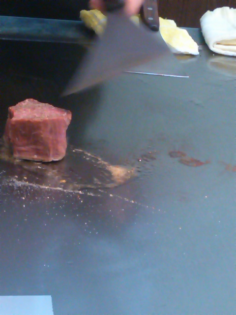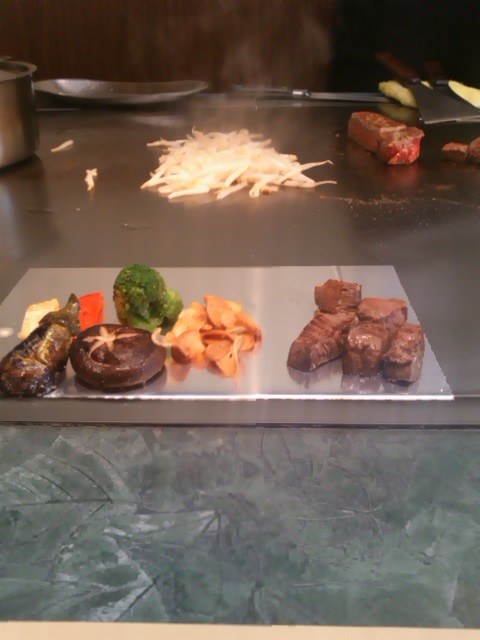 サラダ・ライス・コーヒーが付き、鉄板はステーキ以外にも豆腐・シイタケ・茄子・ブロッコリー・パプリカ・もやし・ガーリックが付いてきます。メインの写真はヒレのシェアした半分、奥に見えるのはサーロイン。ボリュームがありました。