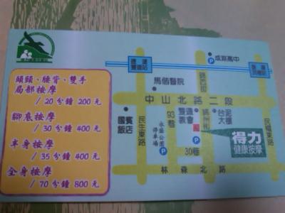 全身800元(70分)、半身400元(35分)、部分按摩200元(20分)、足裏400元(30分)