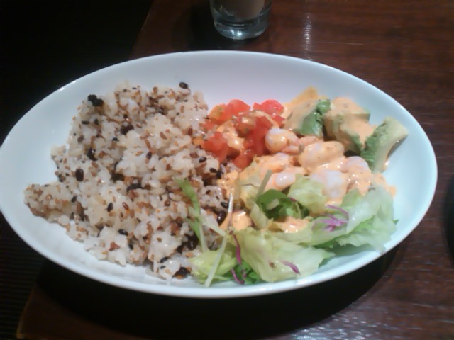 サラダ、ドリンク、エビ、ナン、ライス付き。+100円でチーズナンにしました。