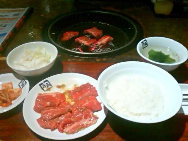 お肉以外にキムチとスープとやみつきキャベツが付き、ドリンクは別料金。