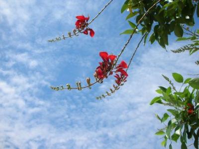 いかにも南国らしい、青い空と赤い花のコントラスト。でも、よく見てみると...