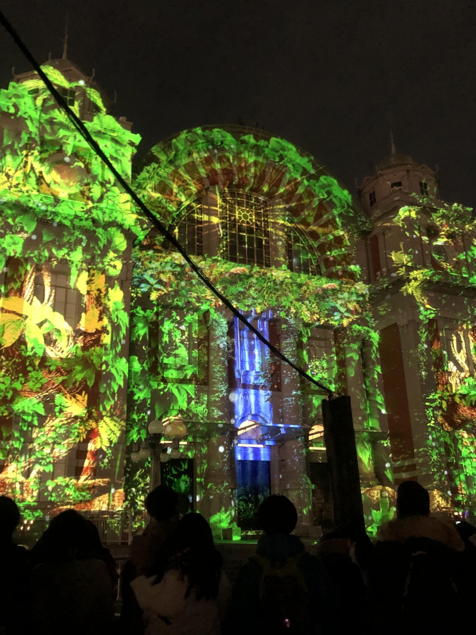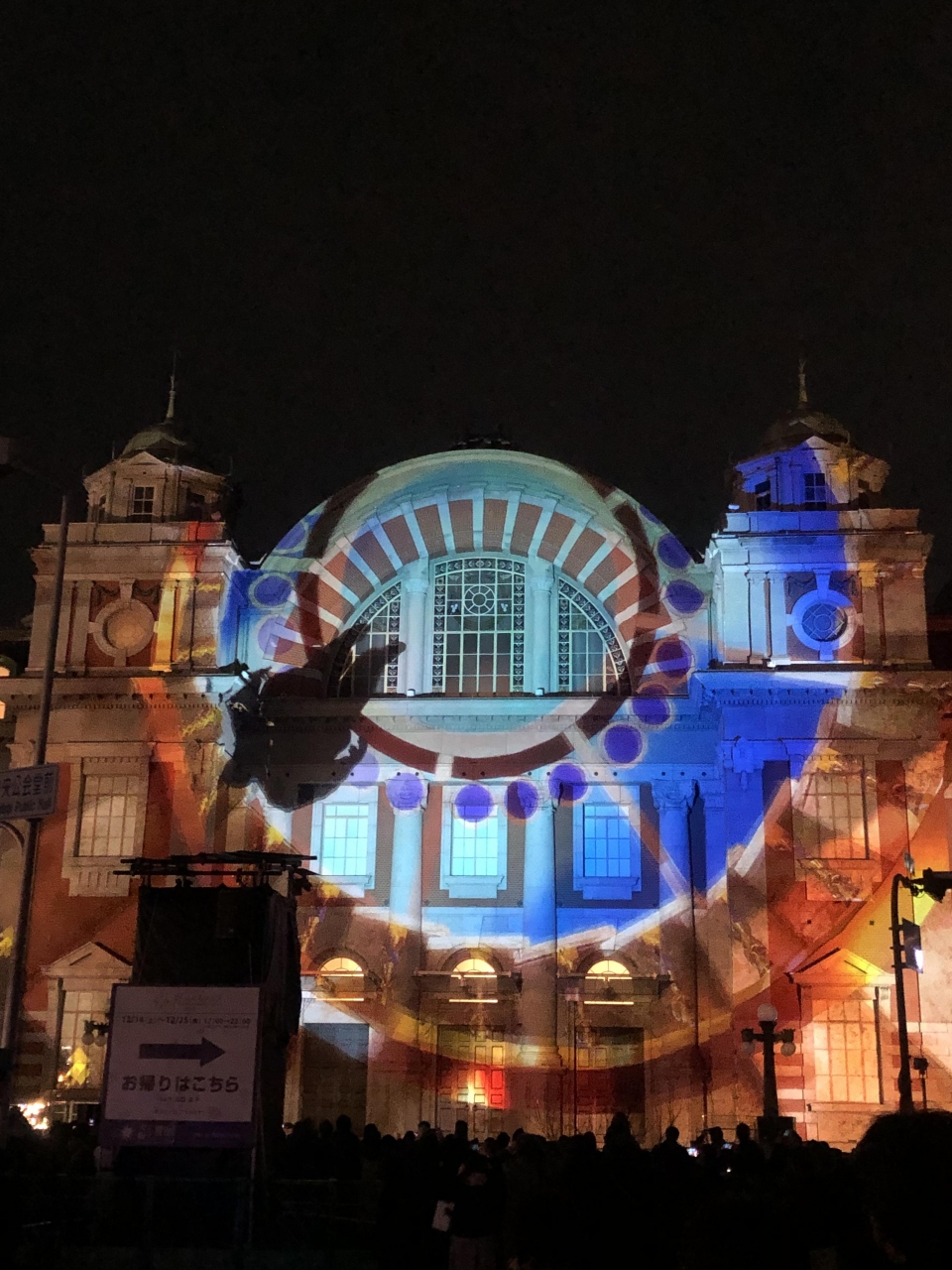 ここ数年まえから12月頃になると、御堂筋のイチョウ並木が難波までイルミネーションで飾られます。梅田からぶらぶら一駅歩いて大阪市役所に到着。市役所の横から入るとイルミネーションの通路になります。奥に入っていくと、露店が軒を連ね中央公会堂にはプジェクションマッピングがとても綺麗です。クリスマスシーズンには最適です。