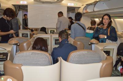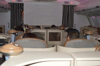 満席とかで、ラッキーにもビジネスクラスへ。ウキウキですね。そんな訳でもちろん贅沢を言える筋合いではないのを承知の上で…2−4−2の配列なので座席幅は狭いですね。配置は上手くずらせてあるので、独立感はありますが、真ん中の2席は、カップル以外の組み合わせだと、長時間辛いのでは。
