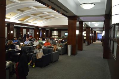 十分な広さがあるので、混雑しているという実感は全くありませんでした。日本などのラウンジとの違いは、アルコールや軽食のチケットが渡され交換して頂く、というものでした。往復2度利用しましたが、行きは国内便への乗り継ぎだったせいか、ドリンクチケット1枚のみ。帰りはドリンク2枚と、ミールクーポン1枚でした。
