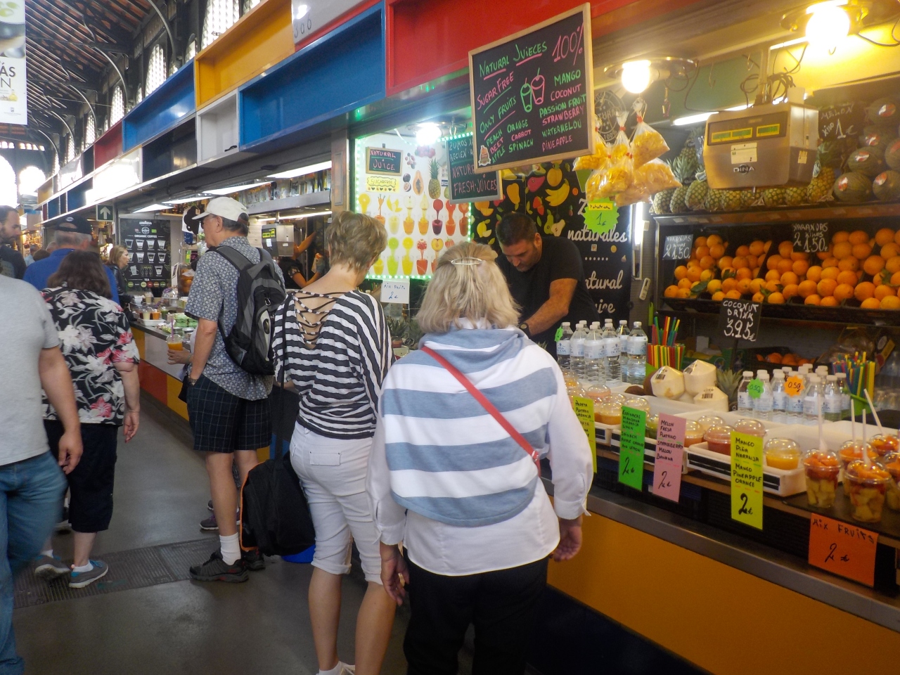 マラガ港から徒歩10分ほどの所に位置する市場。肉や魚や野菜にチーズや生ハム等々、多くの店が並ぶ市場内は見るだけでも楽しい場所ですが、内部にはおそらく10軒近くもあるだろうというほどバルの数も多くて、美味しさを競い合っているかのようでした。