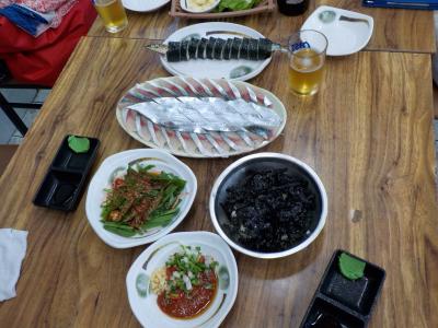 サバと太刀の刺身も新鮮、名物のサンマを巻いたキンパも、想像以上の美味しさでした。美味しいので太刀の塩焼きも追加。ついついビールもすすみました。- 旅行時期