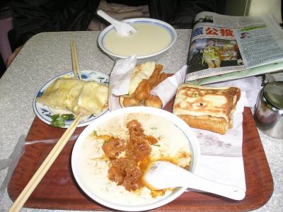 シェラトンタイペイから程近くにある豆漿店です。ビルの2階に上がると「持ち帰り」の人と「イートイン」の人用で列が出来ておりました。私は砂糖入り、家内はにがりの入った豆漿をオーダーしました。で、このにがり入りのって、時間が経つと段々固まってきて、ホントお豆腐みたいになってくるんですね。いや不思議でした。もちろん味はどちらも◎。付け合せの油条もふつうのお店のとは違い、油条をナンのような大餅で巻かれていて、そりゃボリュームも抜群でした。お店の人たちも忙しい中で私たちに「美味いか?」「ちゃんと食べてるか」って気をかけてくれるし・・・。心から楽しめました。