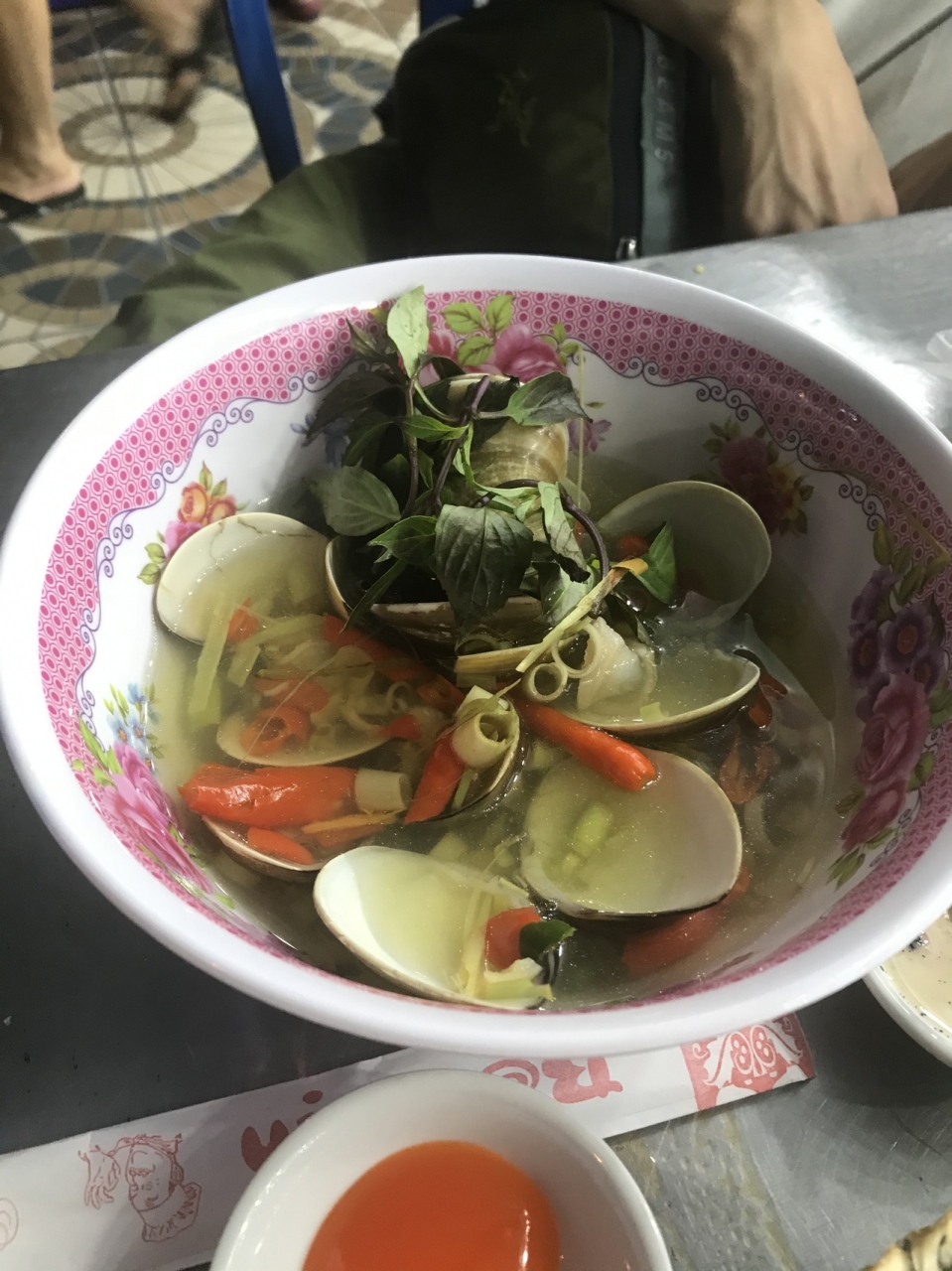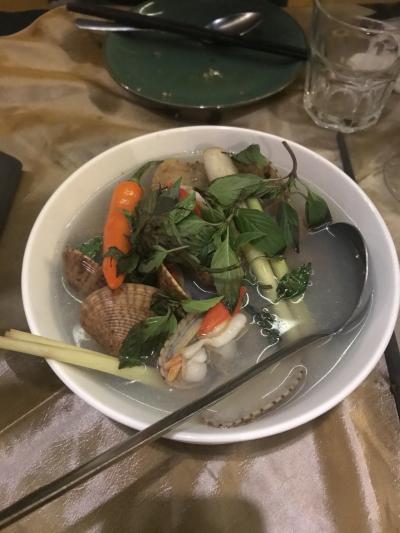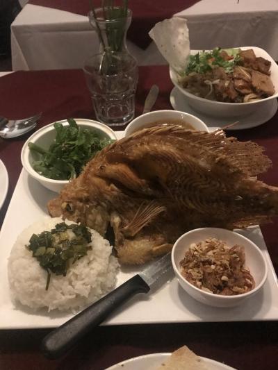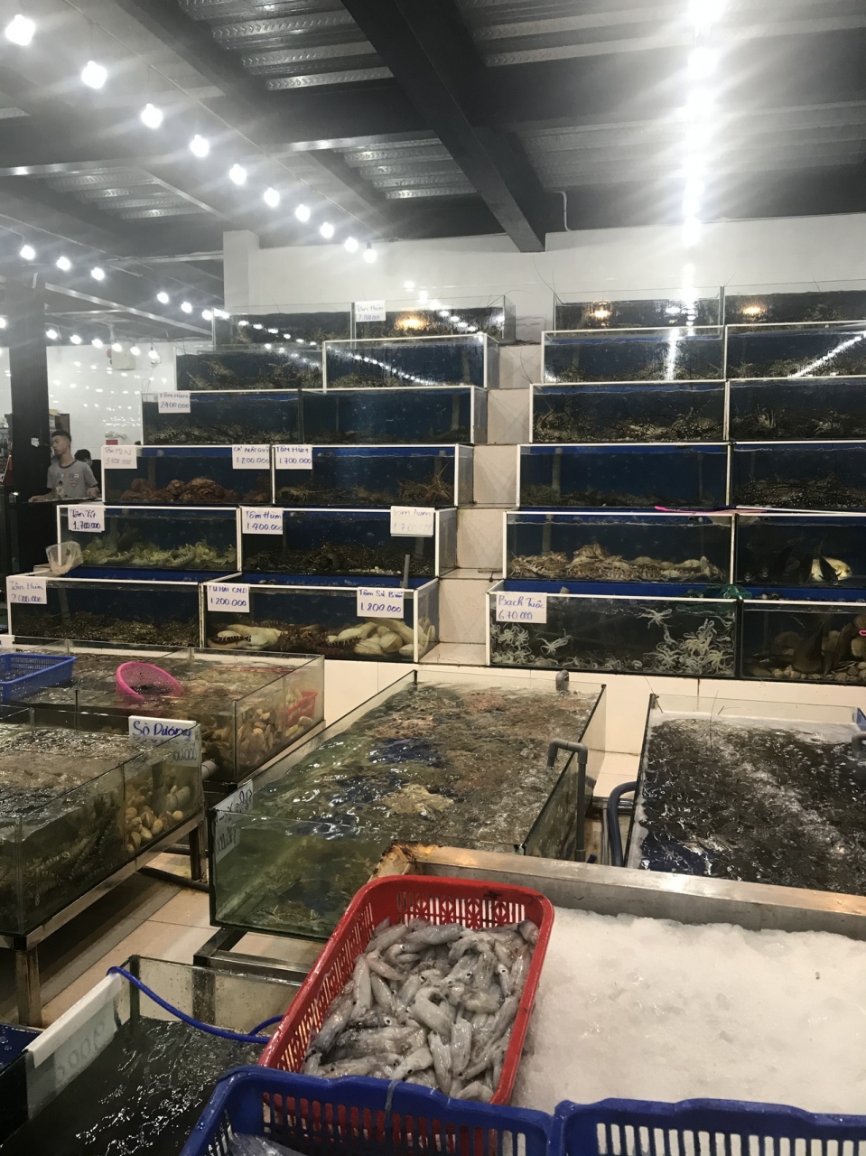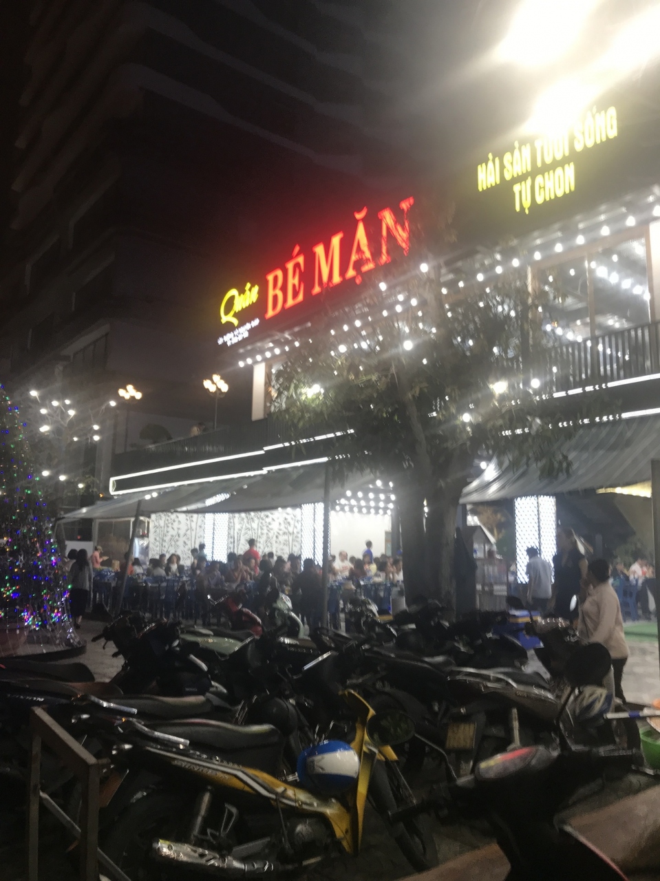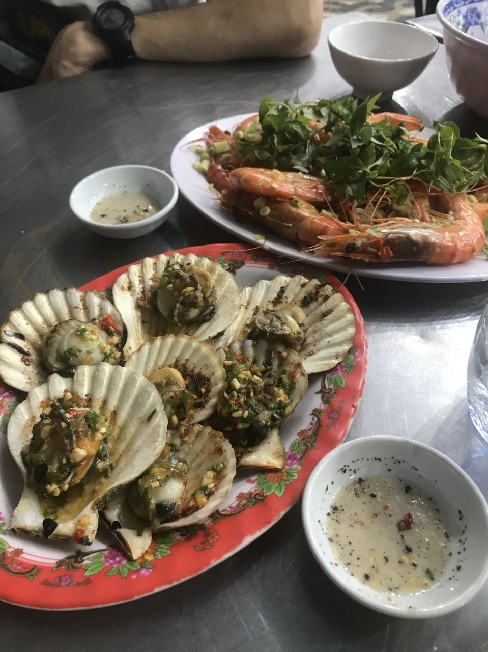 家族3人で夜ご飯のため夕方6時過ぎに訪問。満席に近かったです。テーブルを自分で陣取り番号を書いた紙をもらいます。それを持って生簀のあるところへ。店員さんをつかまえて注文するのですが、なかなかつかまらず。。。遠慮してたら食事にありつけません。つかまえたら物を指定して(1キロかハーフか)調理法を指定するのですが、英語は通じないので写真を見せました!蒸し海老とヒイラギ貝のネギ焼きとハマグリのレモングラス蒸し(みなさんのおススメを参考に)そしたら、生簀の後ろの方に海鮮以外のメニュー(炒飯や空芯菜の炒め物など)のところに行くよう指示があり、ついていってお目当てのものをとる、そしてテーブルにつきます。テーブルについたら、飲み物を店員さんをつかまえてまた注文、後は待ちます。高度すぎてどっと疲れましたが、食事が届いてビックリ!全て唐辛子入りで子どもは涙を流して食べることに。大人にも結構刺激的でしたが、素材に勝るものはなし!めちゃくちゃ美味しい!本当は牡蠣を食べたかったのをビビリなので頼まず後悔しました。。。飲み物は氷をくれと言ったらくれます。全て込みで84万ドン弱でした。お店は地元の人も観光客もみんなで賑わってます。とっても賑やかで楽しい雰囲気を味わうことができました☆