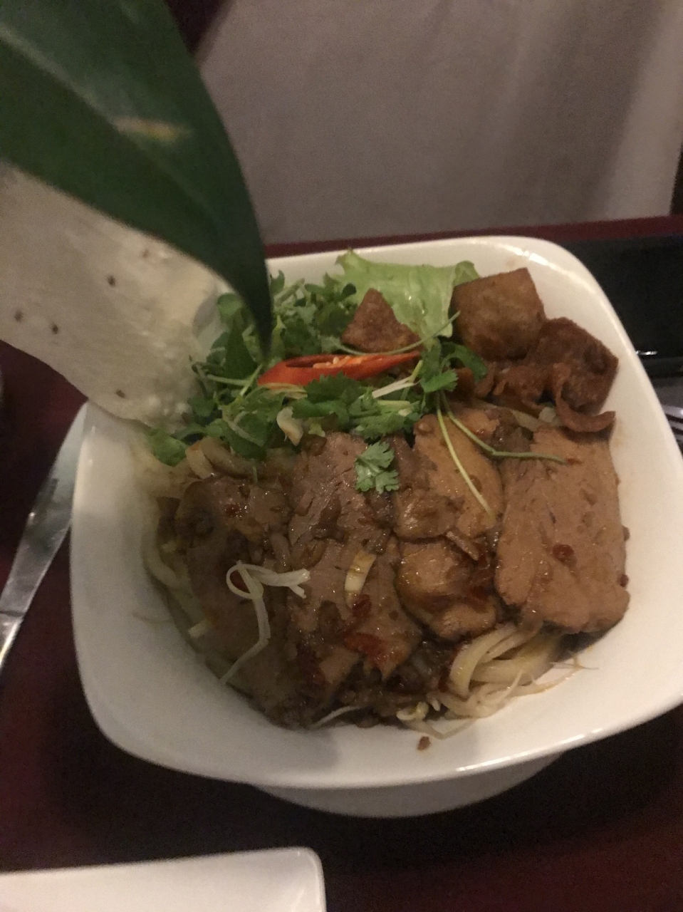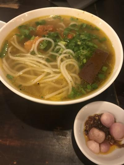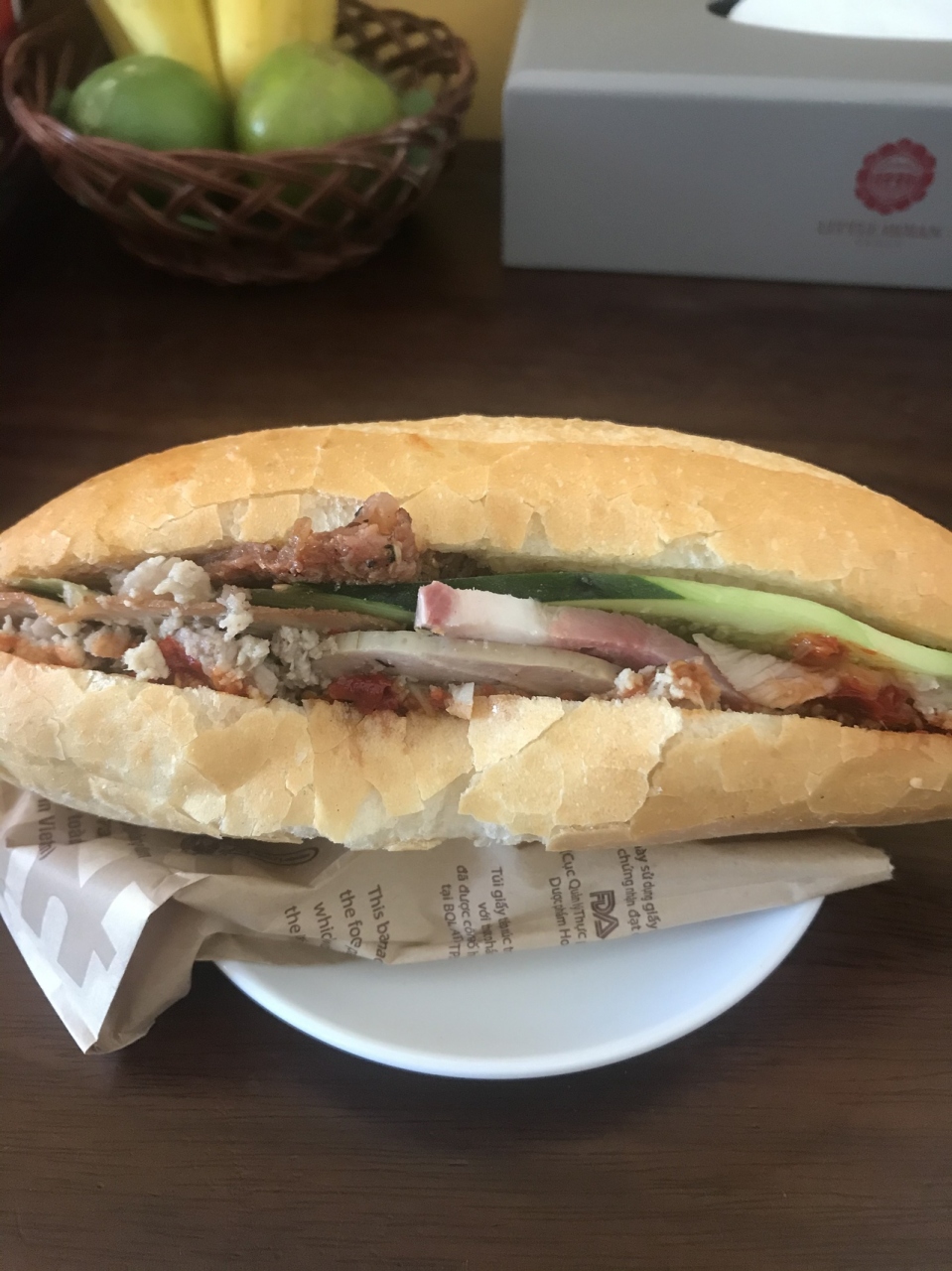世界一美味しいバインミーと名高いこちらのお店へ。本当は行きたかったのですが、体調が悪くどうしても諦めきれずグラブタクシーでホテルまで配達をしてもらいました。お昼どきでしたがお店から徒歩15分ほどの距離にあるホテルまで30分程で届きました。バインミータップカム(全部入り)をノースパイシーで。ひとつ3万ドン。レバーペーストやお肉やら野菜やらカレーの味などが食べ進めるごとにいろんな味がして複雑に混じり合って本当美味しい!パンもカリッサクッフワッでこんな美味しいフランスパンはなかなかお目にかかれないと思います。リピ確実です。