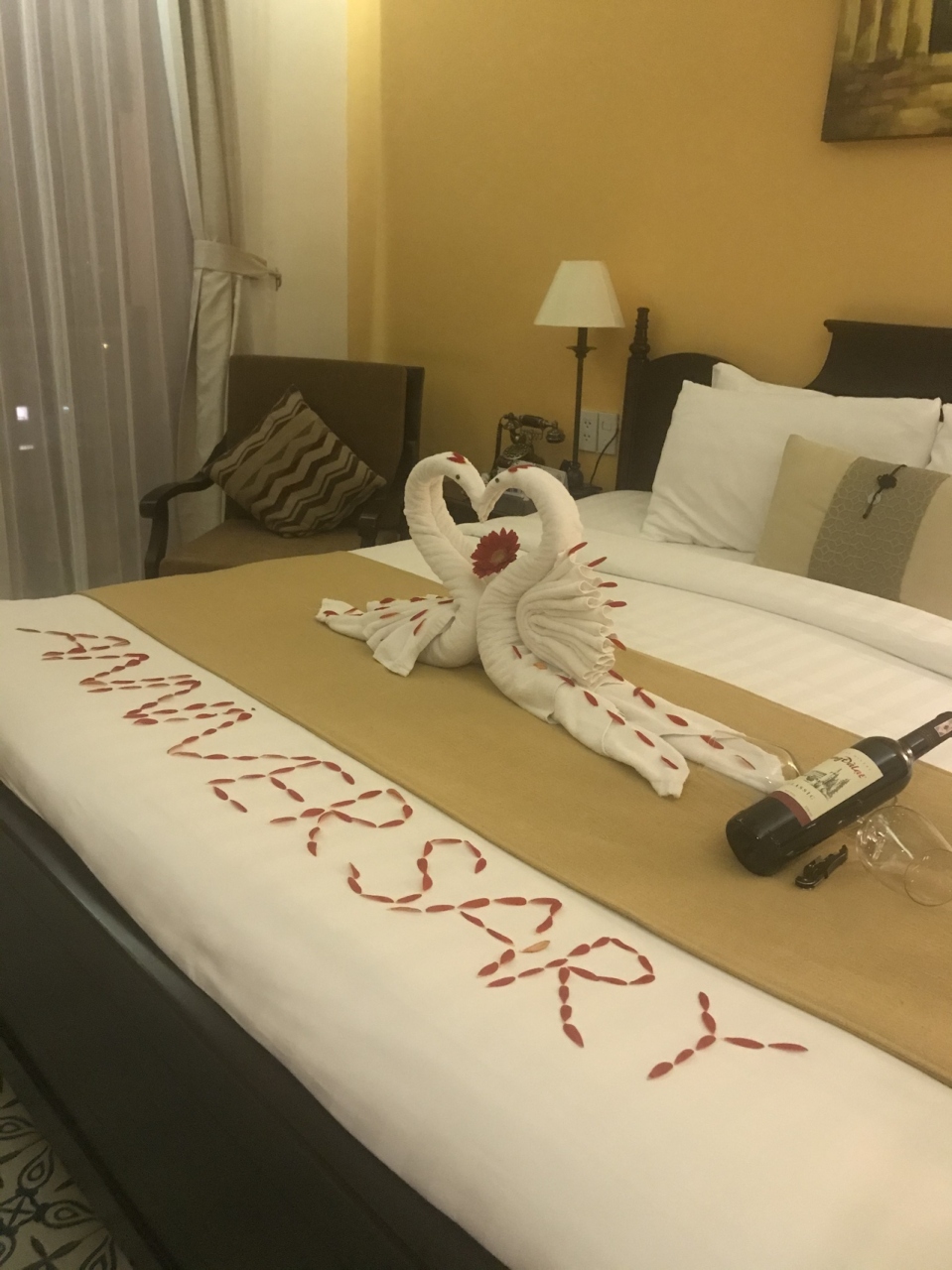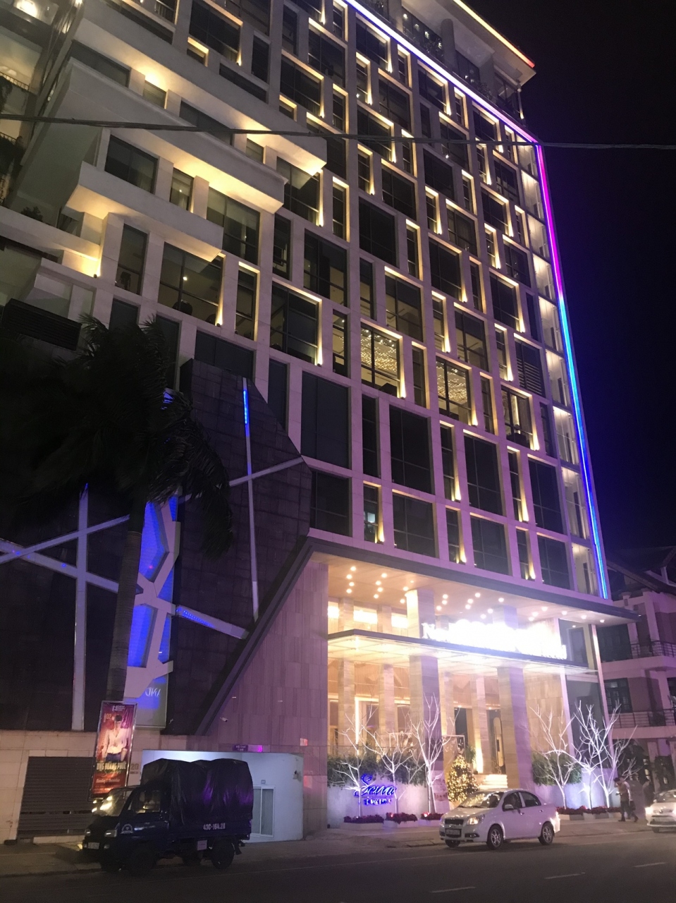 大晦日と元旦に2泊。アゴダから予約した際に結婚記念日と入れたところ、見晴らしの良いお部屋をアサインしてくれ、ターンダウンでワインとお花のプレゼント。お部屋からカウントダウンの花火が見えました。朝食もベトナムサラダやおかず、お粥、フルーツなどが日替わりで。しかもどれもとても美味しい!特にエビのお粥が美味しくてびっくりしました。ヴィンパールランドに行くことを朝食の際に来てくれたお姉さんに相談すると、バスの時間を調べてタクシーの運転手にフリーシャトルバスの停留所まで送るよう伝えてくれて本当助かりました。旧市街まで歩いて10分ぐらいとアクセスも良かったです。一泊8000円ちょっとでしたがお値段以上です!本当におススメです。