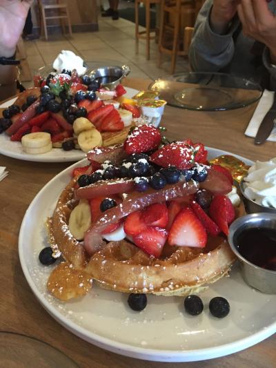 土曜日のKCCに行った帰りに歩いて(途中道に迷って30分程度?のところを1時間以上結果的に歩いてしまった)ようやくたどり着いたのが、10時過ぎで、15分程待って入れました。4人で飲み物とパンケーキ、ワッフルの全部乗せを頼みましたが、来た瞬間キラキラしてて、みんな笑顔になったのを覚えています。パンケーキやワッフルは熱々で、カリカリ感やフワフワ感はありませんでしたが、フルーツがこれでもか!っていうぐらい乗ってていて、フルーツと一緒に食べるケーキって感じでした。場所が少しわかりにくいのと、帰りのバス乗り場の場所が行きと違う場合はチェックしておいたほうがいいですよ!
