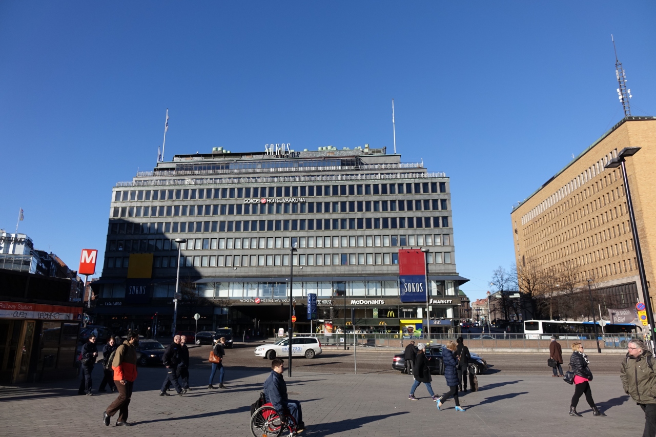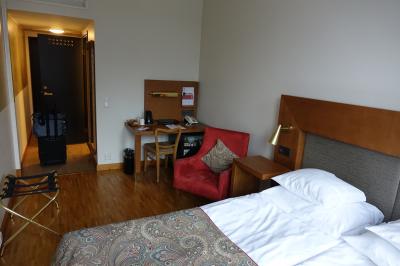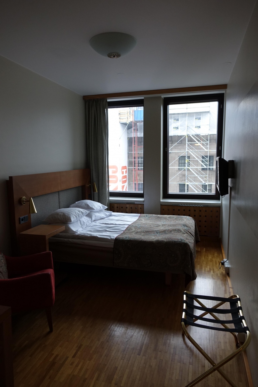 一人旅には十分な広さです。ベッドの広さはクイーンサイズをリクエストしました。長身の私にとっても長さは十分でした。調度品は、アイロンは有り、セーフティーボックスは無し、シャンプーは有り、歯ブラシは無し、無線LANは有り、有線LANは無し、湯沸かしポットは有料(12ユーロ)でリクエストしました。TVチャンネルは、BBCは有り、CNNは無し、日本語放送は無し、で選択肢少なめでした。フロントは英語も通じるし、対応は良かったです。同じビルにSokosデパートが1-5Fに入り、1FにMcDonardや地下にはS-Mart(スーパー)とAlko(酒屋)があり買い物にも不自由はしませんでした。部屋代142ユーロ/泊と安くないですが日本で言えば東京駅の真ん前みたいなものだと思えば高くもない気もします。ヘルシンキカードはホテル受付で買えました。