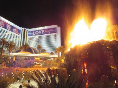 今やラスベガスでも数少ない無料のショーのひとつ、火山の噴火ショーをホテル前でやっています。