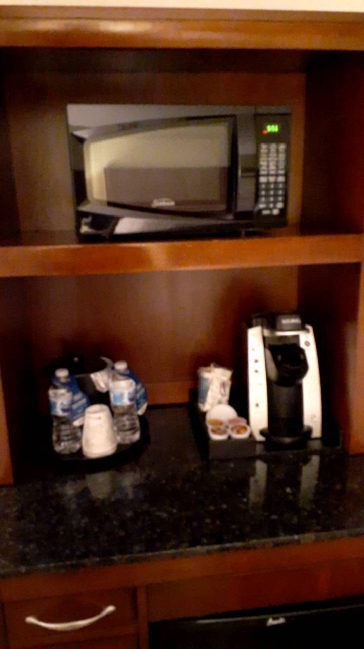 部屋には無料のコーヒーと電子レンジがあり便利です。