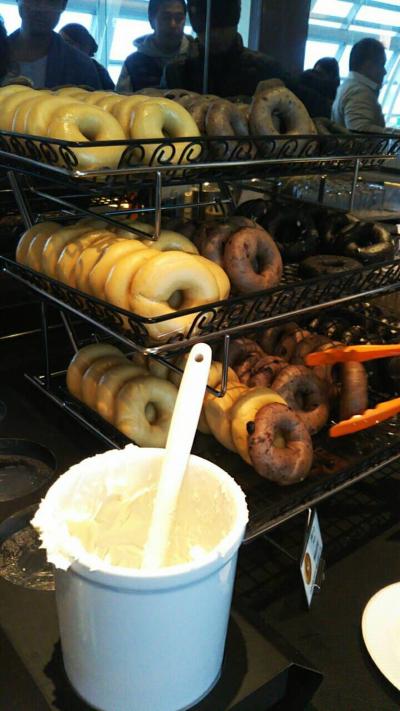 対象のクレジットカードを所持していたので入室しました。連休中の朝8時頃はベーグルとクリームチーズ、飲み物はソフトドリンクがいろいろとありました。