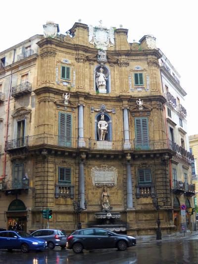 広場に面するように、四つ角にそれぞれ建物が立っていて、壁には3段の装飾が施されている。