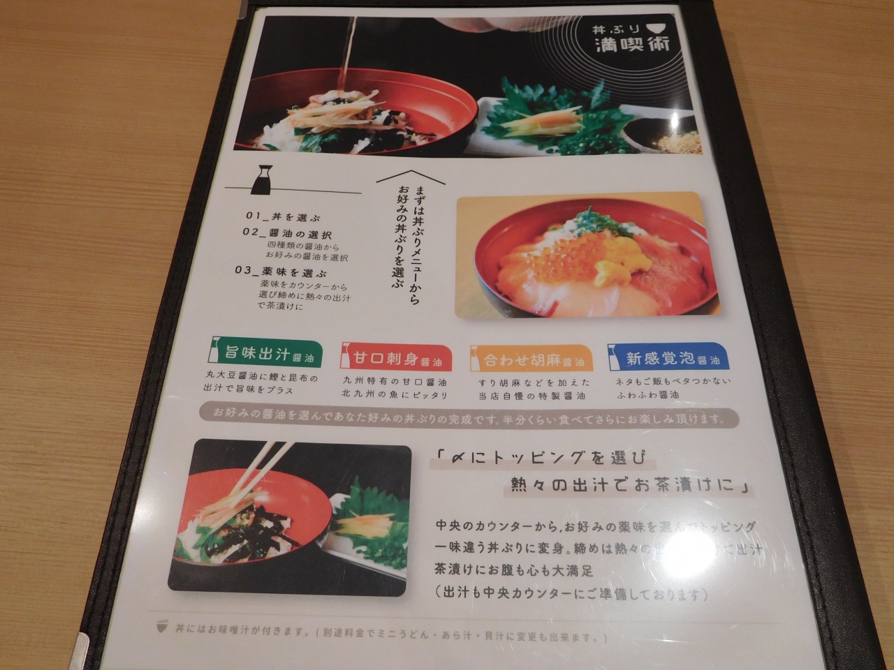 リバーウォーク北九州の4階にある、 関門や玄界灘、近海の新鮮な魚介類を使ったメニューが沢山あるお店です。店内は、木のぬくもりが感じられる、おしゃれなカフェスタイルでした。平日は海鮮丼がお得な値段が食べられました。4種類のお醤油から選び、最後の〆は、お茶漬けにして食べる事も出来るようになっていて、とても美味しかったです。