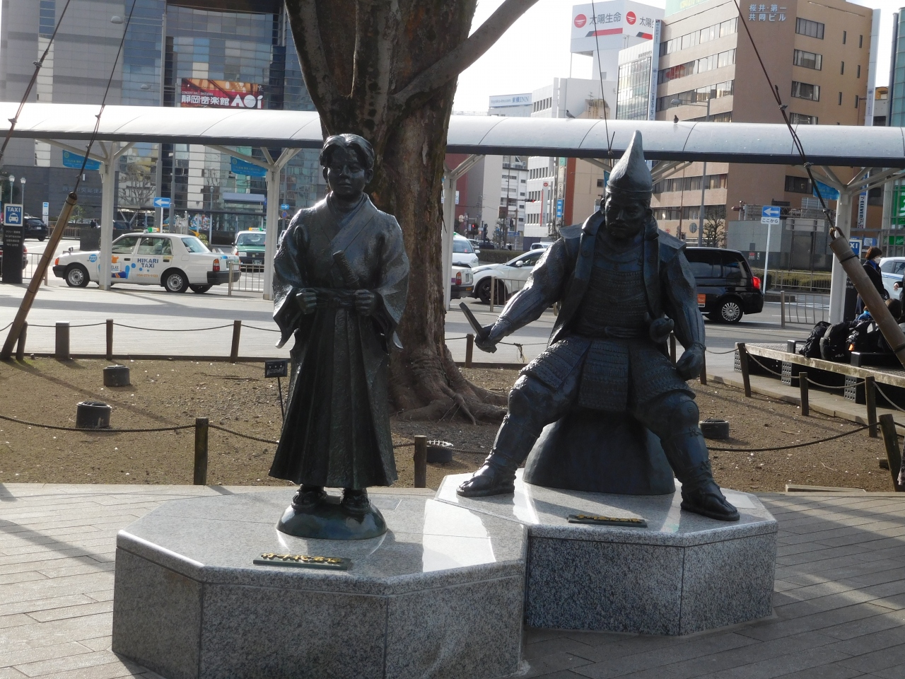 静岡駅北口の広場に設置されている銅像です。徳川家康の幼少期の「竹千代」と、その後ろには、鎧を身にまとった「今川義元」の姿がありました。竹千代は、握りこぶしをにぎり、がっちりと凛々しい姿で立っていました。徳川家康のゆかりの地に来たのだな、と実感するような銅像でした。