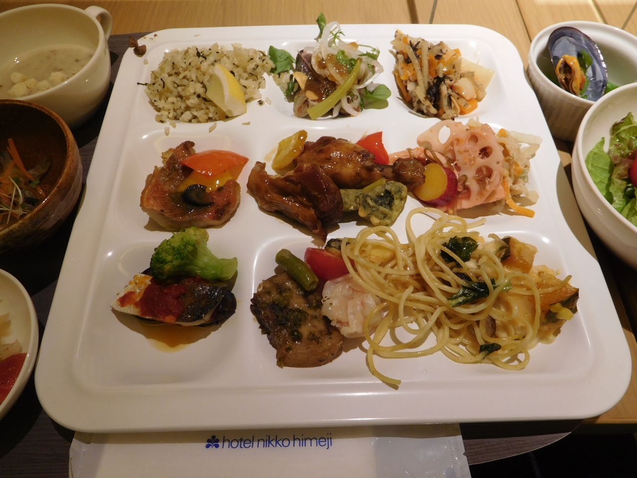 姫路駅前にある「ホテル日航姫路」の1階奥にある、オールダイニングです。2食付きのプランで宿泊したので、ディナーと朝食で2回利用しました。店内中央にあるカウンターにいろいろな料理が並んでいました。夜は、その時々でテーマがあるようで、今回は「兵庫地産地消&瀬戸内・四国」で、瀬戸内レモンを使った料理などがありました。どれもとても美味しく、思わず沢山頂いてしまいました。朝は、ご当地メニューとしてたこ焼きがあったのが嬉しかったです。豪華な内容でとても良かったです。