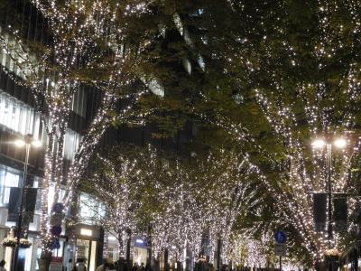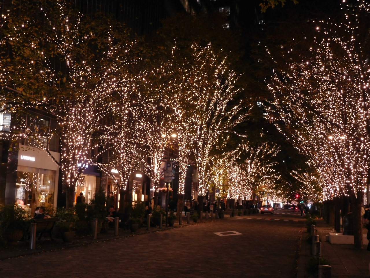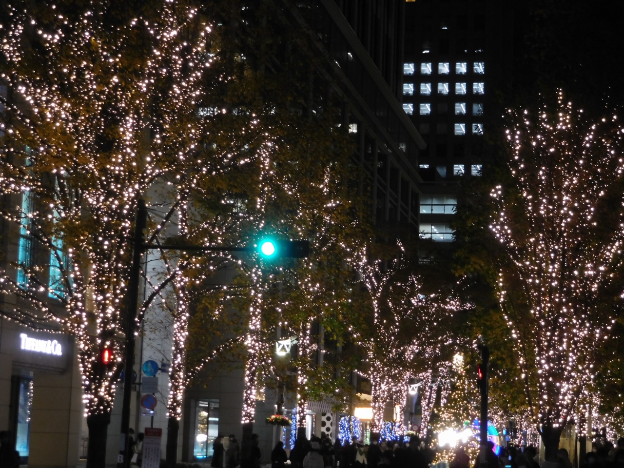 東京駅と有楽町を結ぶ「丸の内仲通り」沿いの街路樹が、シャンパン色に輝くイルミネーションです。派手な音楽や色が変わったりする演出はありませんが、真っ直ぐな通り沿いにずっとイルミネーションが輝いているので、とても綺麗です。11月の平日に訪れたので、まだそんなに人出は多くありませんでしたが、イルミネーションを眺めながら散策していたら、あっという間に感じてしまいました。