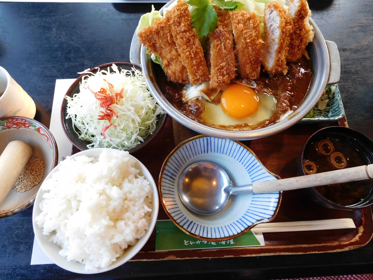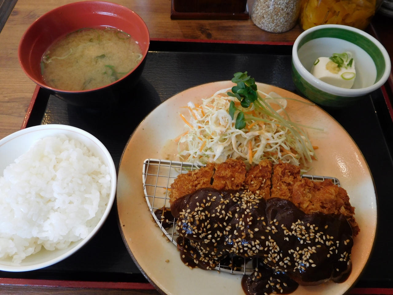 岡崎名物の八丁味噌を使ったメニューがあるお店を探していた所、「岡崎名物八丁味噌美味GUIDE 2015」に、このお店が載っていたので、ナビで検索して行きました。お座敷に座りましたが、ゆったりとした席でした。一度で2つの地元グルメが味わえる「八丁味噌かつどて鍋定食」を注文しました。牛すじ、豚バラ、ホルモンを甘味噌でじっくり煮込んだドテ煮の上に、とんかつが載せられ、卓上コンロで熱々の状態で食べる事が出来ました。ご飯とキャベツはお代りも出来、ボリュームもあり、とても美味しかったです。店員さんの対応もテキパキとしていて、気持ち良く対応して頂けました。