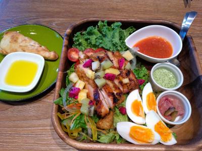 銀座コリドー街のすぐ近くにある、ニッタビル3階にあるレストランです。ランチメニューは5種類位の中から選べるようになっていて、本日のメニューの説明があったので、日ごとに変わるようでした。「パワーサラダランチ」を注文しましたが、たっぷりのサラダの上にタンドリーチキンが載っていて、とても美味しかったです。割とゆったりとしたテーブル配置で、ゆっくり食事が出来て良かったです。