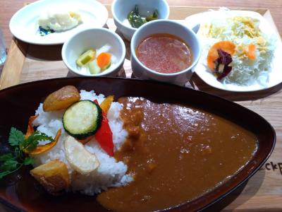 高架下にあるイタメシバルのお店で、半地下になっています。地中海をイメージしたような雰囲気の店内で、テーブル席にはクッションが置いてあったり、居心地の良い感じでした。パスタメニューは2種類が週替わりになるようでした。今回はカレーランチを注文しましたが、サラダや小鉢、スープ、ドリンクも付いていて、お得感があって美味しかったです。