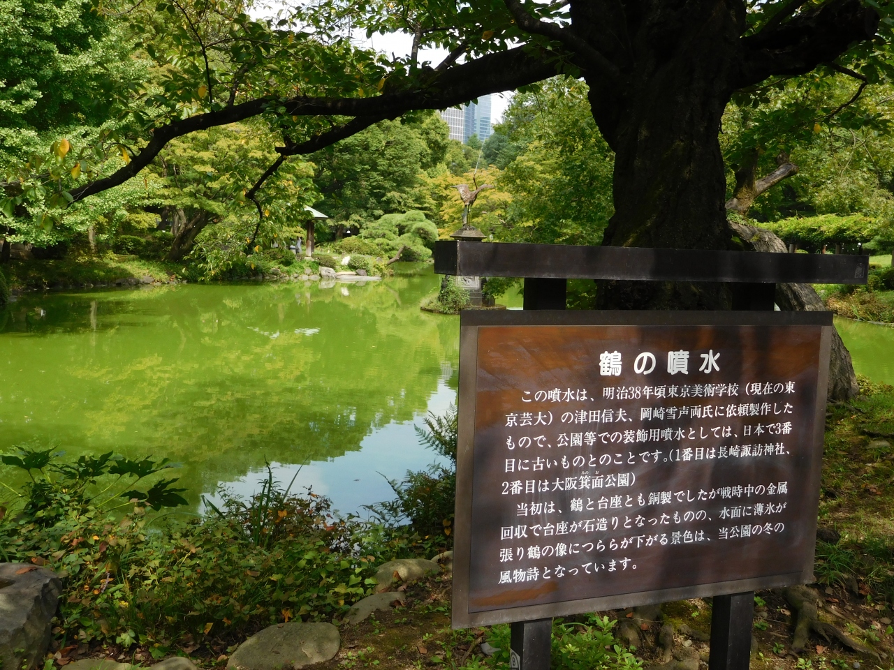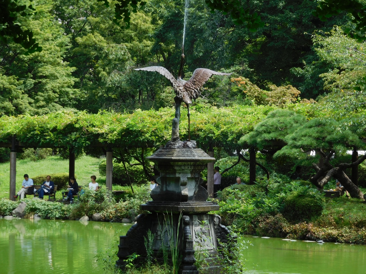 池の水は緑色に濁っていました。池の中央には、鶴が羽ばたいたような姿で、噴水が出ていました。明治38年頃に製作され、装飾噴水としては日本で3番目に古いようです。噴水付近には、屋根の付いた休憩スペースもありました。