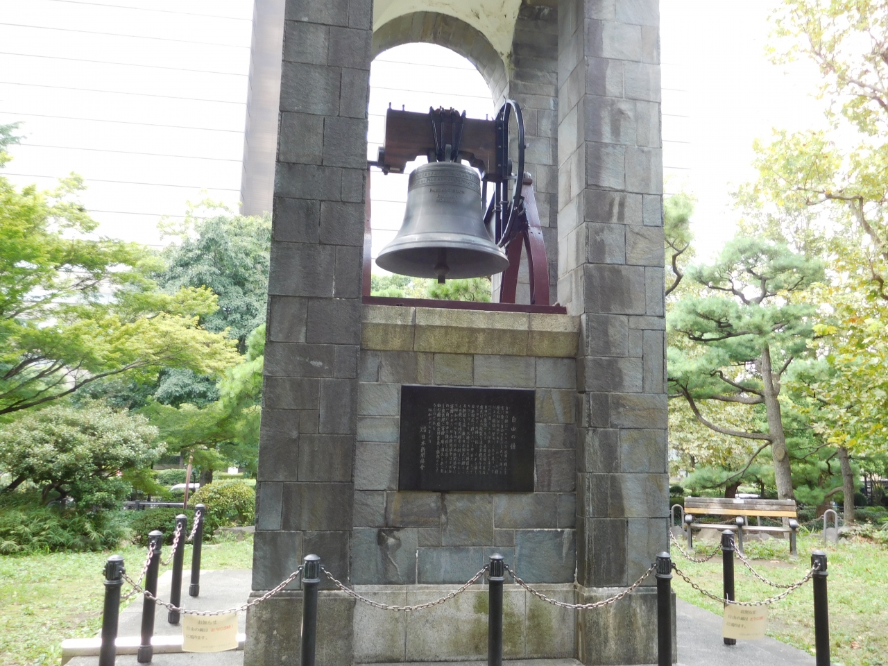 日比谷公園内、テニスコート裏側の三笠山付近にあります。階段を上った小高い場所に、自由の鐘がありました。アメリカ独立宣言に際して自由の喜びを告げた鐘の複製を、戦後アメリカから寄贈されたようです。正午になると鐘が鳴るようですが、残念ながら聞く事は出来ませんでした。ここも周囲にベンチが置いてありました。