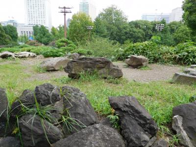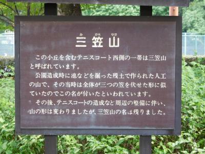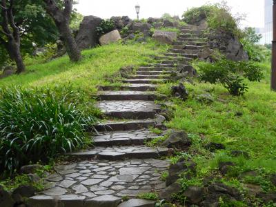 大きめの石の階段が頂上に向かって続いていて、あっという間に頂上に着きました。頂上付近は、岩がゴロゴロしていました。周囲はオフィスビル位しか、特に眺める場所はありません。日比谷公園内のテニスコート裏側に位置し、ひっそりとした存在の場所でした。