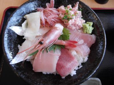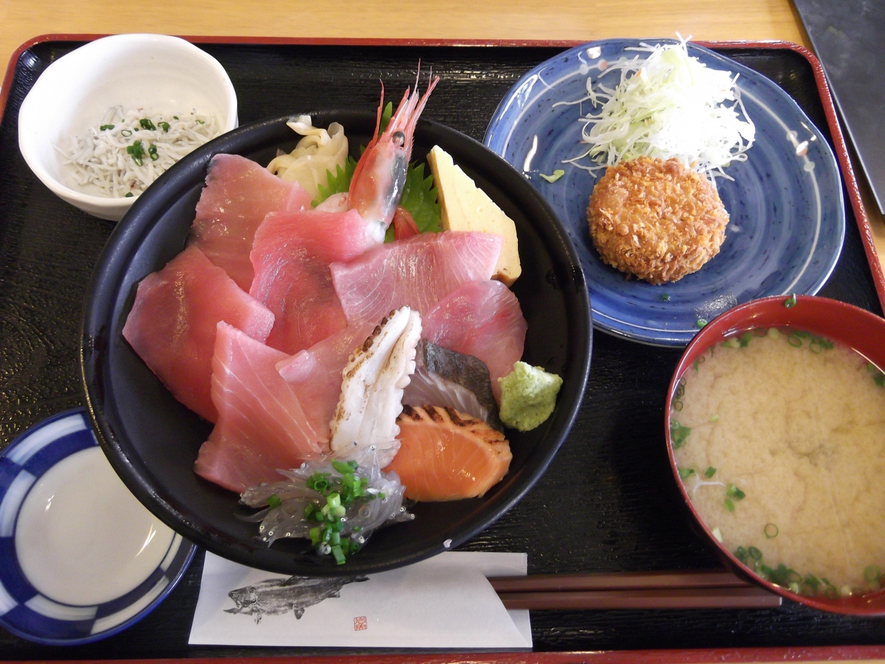 まぐろ館2Fの階段すぐ近くにあるお店です。お昼時に行きましたが、すでに数組が待っている状態でした。このお店の名物は、「まぐろいっぱい丼」ですが、まぐろだけだと飽きてしまいそうなので、8種類のお刺身が載った海鮮丼にしました。おみそ汁、しらす、まぐろコロッケが付いて来て、結構ボリュームがあり満足でした。混んでいましたが割と回転が早く、私達も食べ終わったらすぐにお店を出ました。