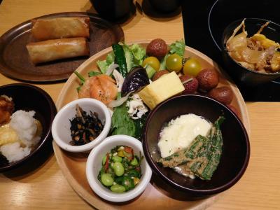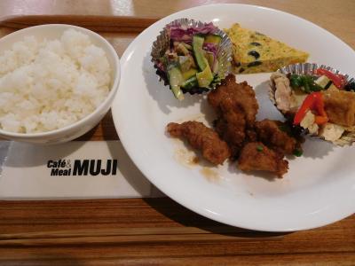 無印良品の2階にある、セルフサービスタイプのカフェレストランです。店内はガラス張りになっているので、お店の混雑状況が確認しやすいです。列に並んでいる間に席が無くなってしまう事があるので、先に銀色のプレートで席を確保してから、メニューを選びに行きます。今回は、選べるデリ4品とご飯にしました。季節の野菜を沢山使っている、色どり鮮やかなメニューが多いので、嬉しいです。2人掛けのテーブルが多いので、買い物帰りに1人でさくっと食事をしたい場合にも、気軽に利用する事が出来るので、とても便利です。各テーブルに荷物置きがあったり、全体的に木のぬくもりが感じられるような雰囲気で、思わずホッとしてしまう場所です。