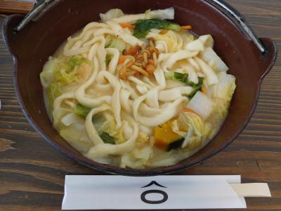 以前「ほうとう不動」の別の店舗に行きましたが、今回は、雲をイメージした真っ白な建物の「東恋路店」に行きました。お店の前で記念撮影する人が多かったです。中に入ると、天井が高いので、ゆったりとした雰囲気のお店でした。4人掛けのテーブル席に案内されましたが、テーブルの形も雲をイメージしているのか、片側がひょうたんのようにカーブを描いていました。ほうとうの種類は1種類のみで、あとはサイドメニューがいくつかありました。ほうとうは、白菜が沢山入っていて、かなりあっさりとした味付けです。(麺もどちらかというと、他のほうとうに比べると細めかなと思います。)結構ボリュームがありますが、あっさりしているので完食しました。