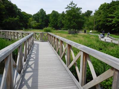 深大寺の近くにあり、無料で開放されています。湿地帯に木道が設置してあるので、ぐるっと散策する事が出来ました。入口付近には、花菖蒲が咲いていました。奥の方の池では、水が濁っていましたが、亀が数匹、のんびり泳いでいる姿が見れました。