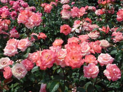 TVで満開の「ばら園」を紹介しているのを観て、初めて訪れました。広い公園内の一画に、「国際ばらコンクール花壇」と「ばら園」がありました。コンクール花壇は、ひと株づつ丁寧に展示されていましたが、隣の「ばら園」には、噴水を囲むように、バラが見事に咲いていました。ちょうど満開の見頃の時期に来れたので、花びらもピンとしていて、すごく綺麗でした。色々な種類のバラが個性的に咲いていて、沢山写真を撮る事が出来ました。真夏のような日差しの中でしたが、来て良かったと思いました。