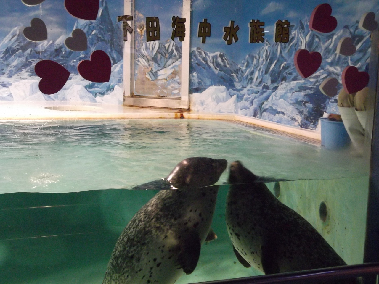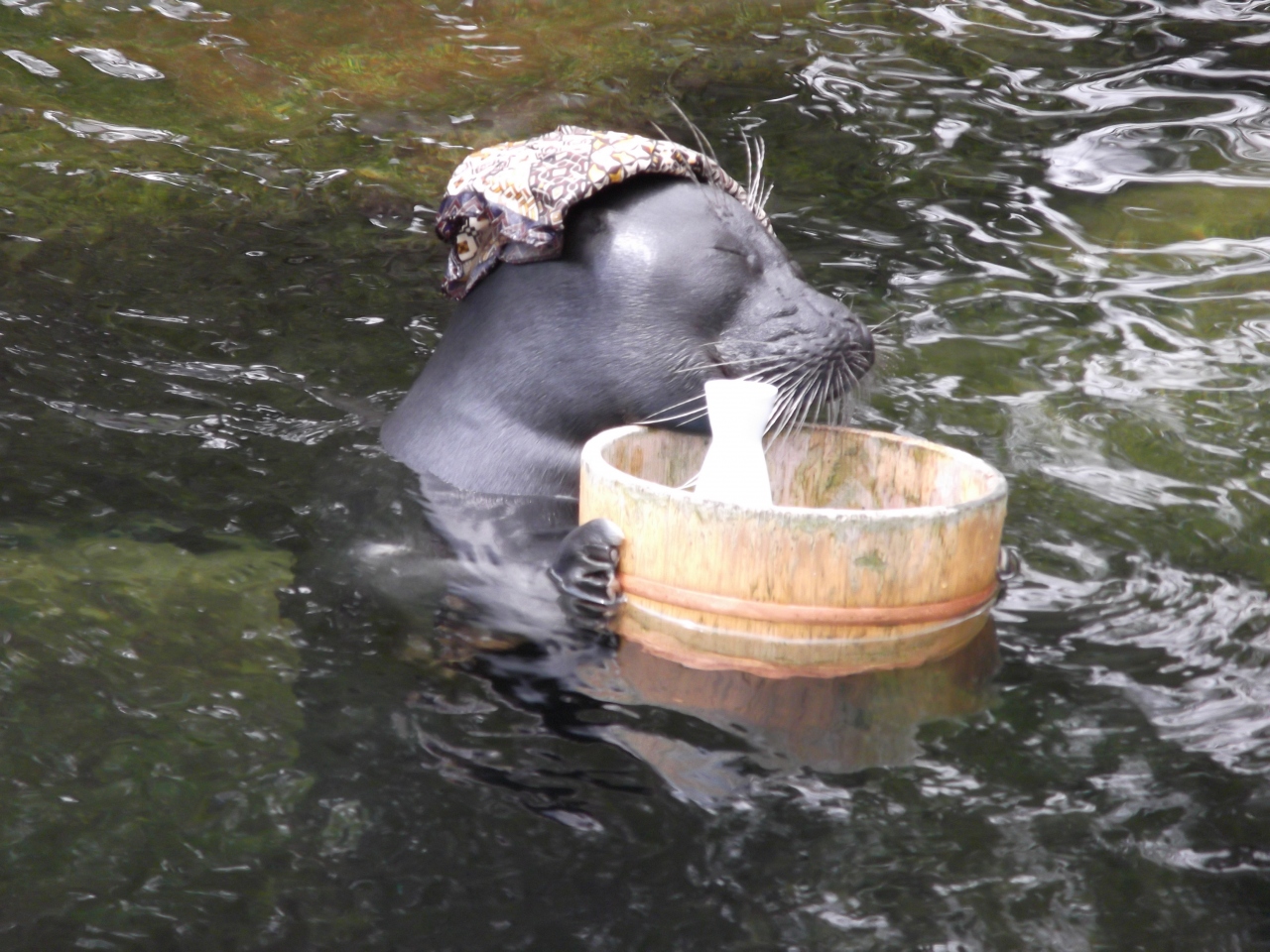 中央の水槽では、魚眼レンズがあり、覗いているとイルカが寄ってきたり、青色の大きな魚が鎮座していたり、次から次へと色々な魚が来て、ずっと見ていても飽きない位でした。淡水館はなかなか興味深い展示が多かったです。バイカルアザラシ広場で行われるショーには4頭参加し、2頭×2頭の組み合わせで、ショーを行っていました。テニスボール、サーフィン、輪っかを使った芸の後、温泉バージョン、そして、季節柄、端午の節句バージョンもありました。お茶目な様子が見れて可愛かったです。
