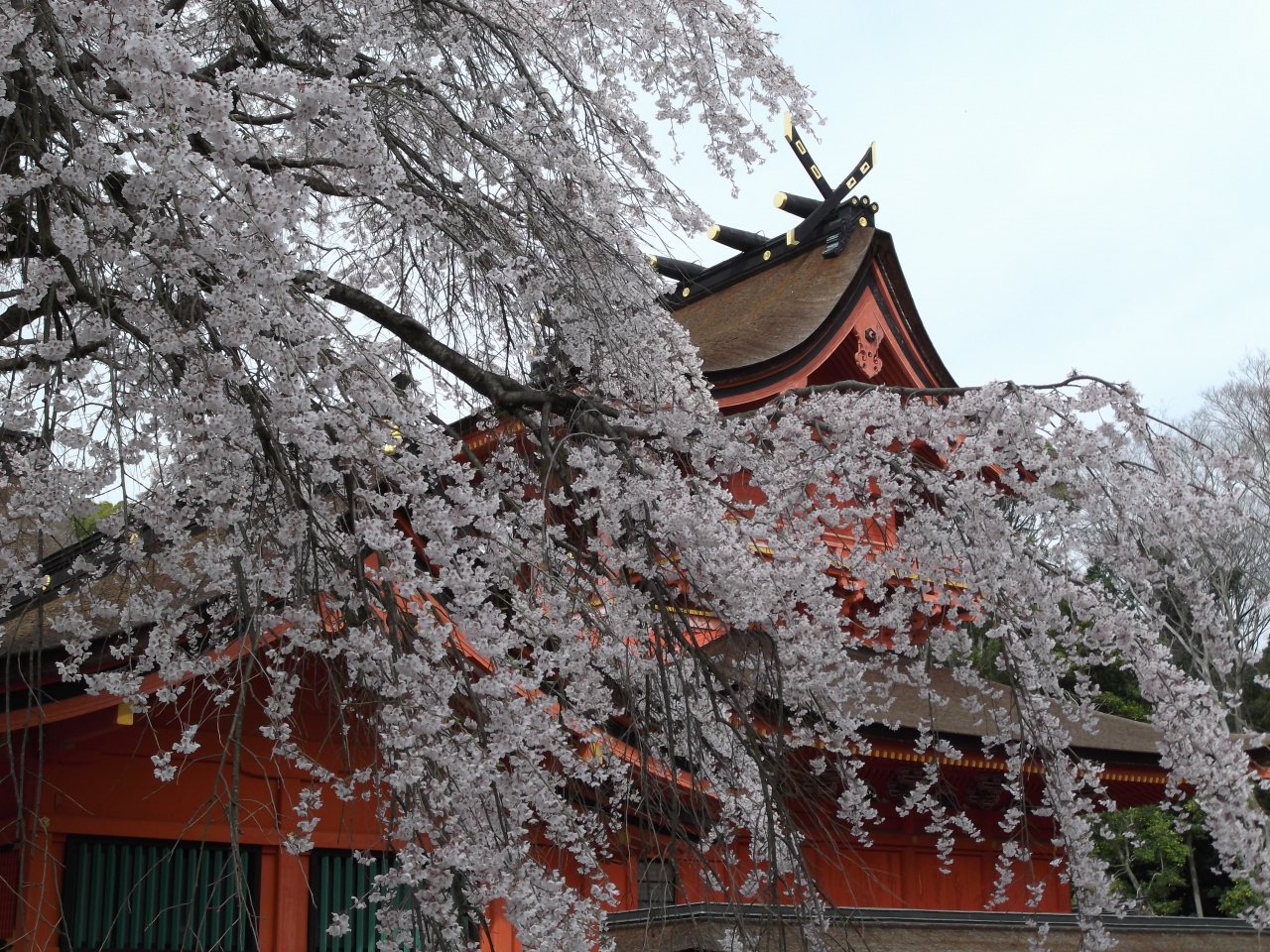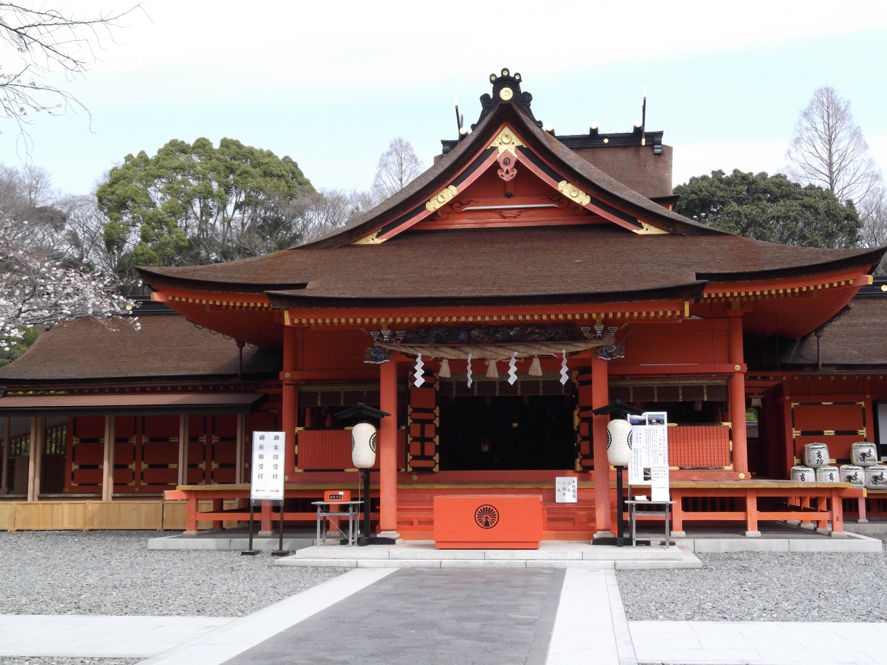 島根半島の西側にあり、海岸沿いに曲がりくねった道を進んで行くと到着しました。鮮やかな朱の楼門は、すごく綺麗でしたが...、その奥にある下の宮、天照大神が祀られている「日沈宮」がちょうど改装中で、お賽銭箱の部分以外は、見事にシートで覆われてしまっていたのがとても残念でした。。改装中でなければ、立派な姿が見れると思いました。- 旅行時期