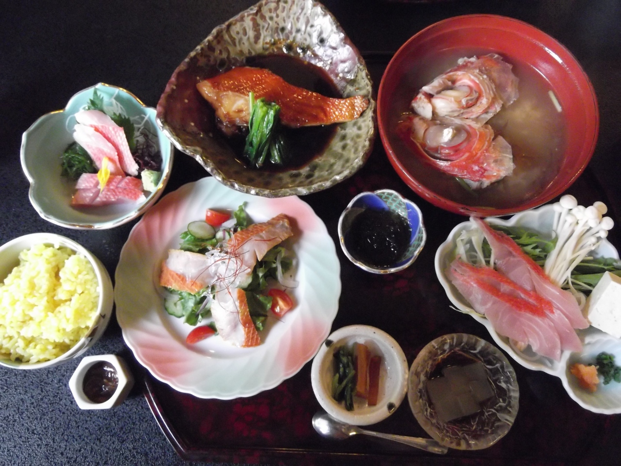 店内に入ると、大きな生け簀を囲んだテーブル席や、奥の方にはお座敷やテーブル席もありました。お昼時だったので、かなり混雑していました。このお店には何度か来た事があり、いつもは2000円台の金目鯛料理を注文していましたが、今回は、ちょっと奮発して「金目鯛づくし膳」を注文しました。結構いいお値段なので、きっとすごいボリュームなんだろうなぁ...と期待していたら、値段の割には、あれ??こんなもんなの?とちょっと期待外れでした。金目鯛料理自体は美味しかったので、アップグレードしない方が十分に満足出来たかな、と思ってしまいました。