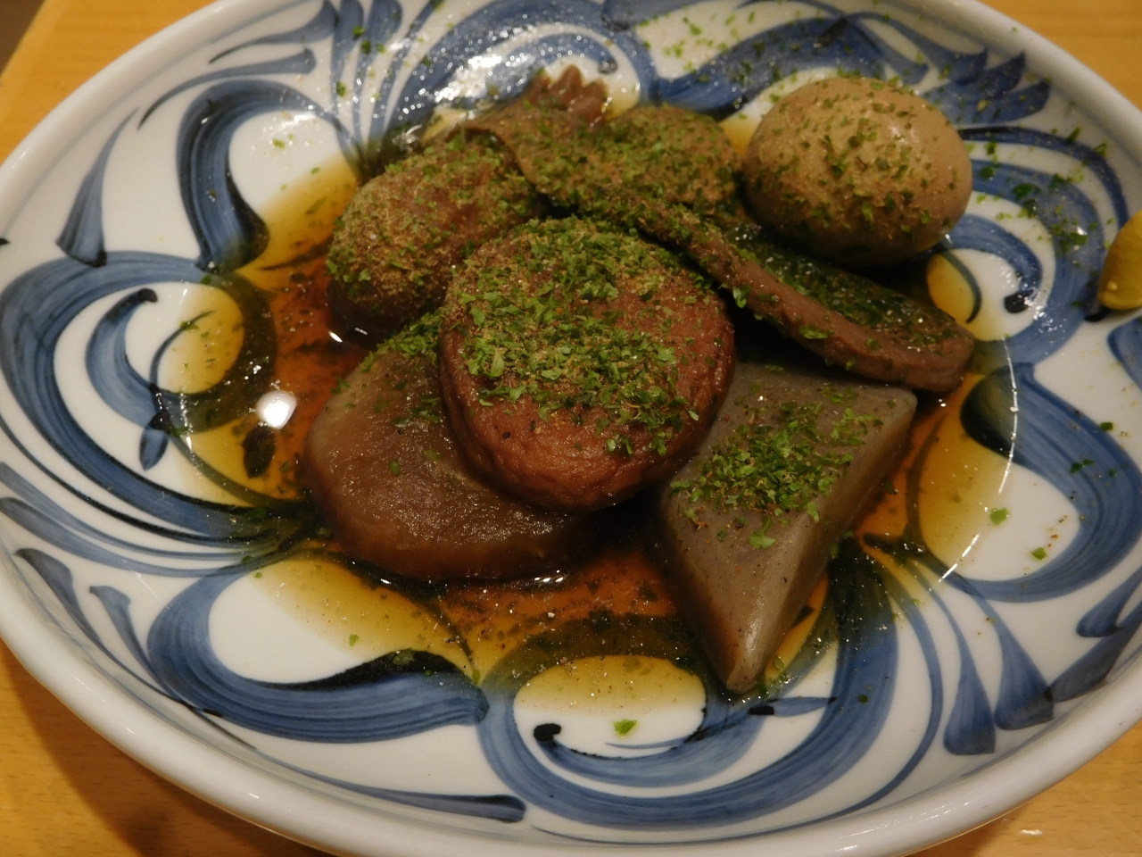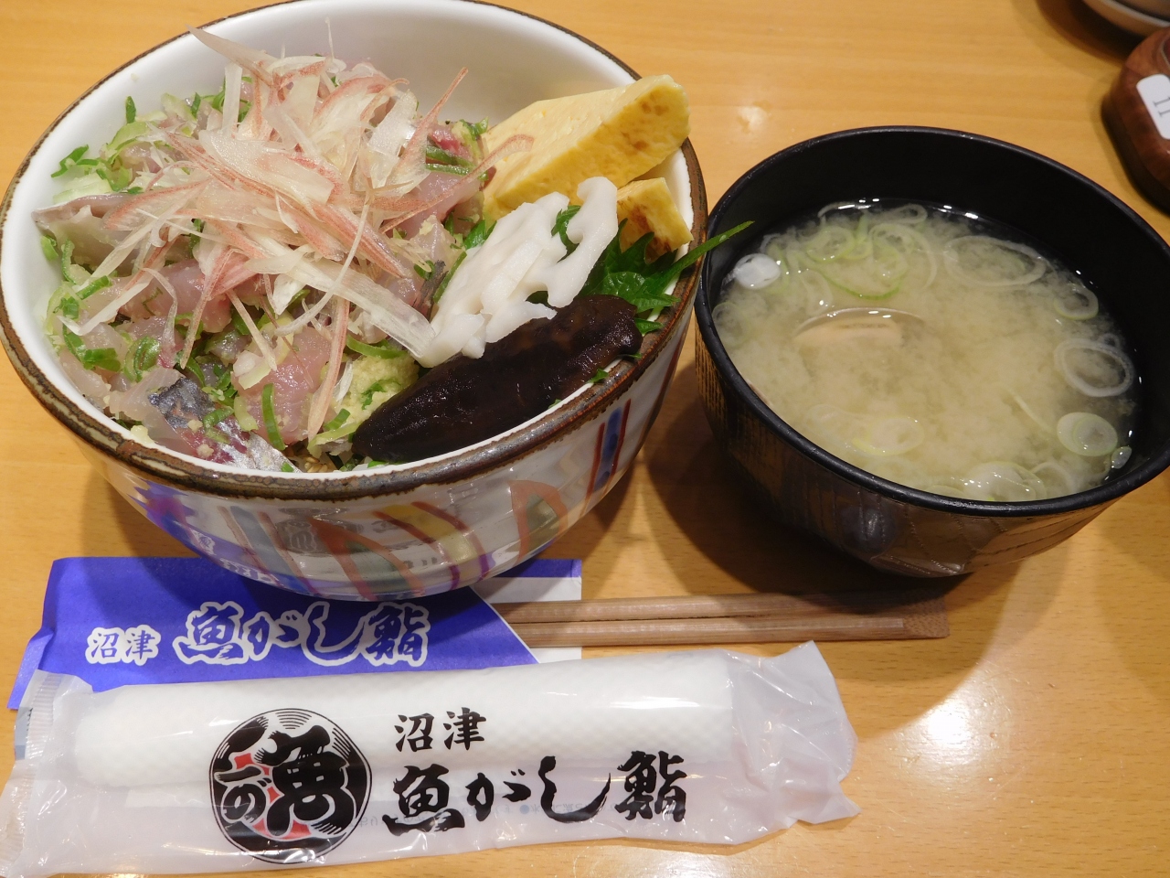 JR三島駅南口を出てすぐ左側にある「沼津魚がし鮨」です。店内に入ると、カウンター席かテーブル席の希望を聞かれました。休日のランチは、14時までだった為、通常メニューの中から選びました。期間限定の「あじたたき丼(貝汁付)」と「静岡おでん」を注文しました。あじのたたき丼は、ミョウガが沢山乗っていて、さっぱりと美味しく頂きました。静岡おでんも、1人前に盛られた状態で出てきて、美味しく頂きました。駅近の場所なので、テイクアウト購入で訪れる人も結構いて、人気のお店のようでした。