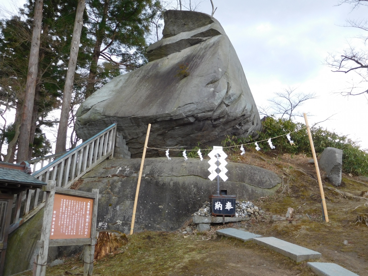 「櫻山神社」の駐車場近く、小高い場所にそびえ立つようにして「烏帽子岩」が鎮座しています。神社の脇にある階段を上っていくと、「烏帽子岩」のすぐ近くまで行けるようになっていて、岩の向かい側には、南部稲荷神社も祀られていました。南部藩盛岡の吉兆のシンボルとして崇められているようで、とてもパワーを感じました。