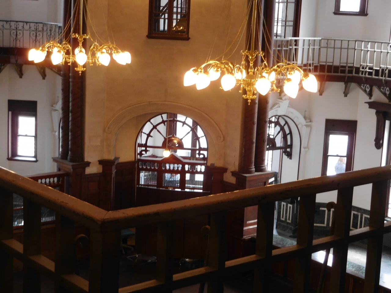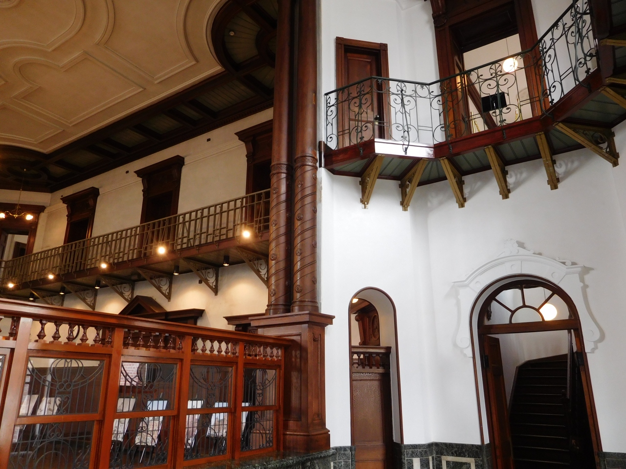 岩手銀行(旧盛岡銀行)の本店として、長い間営業していましたが、現在は、国の重要文化財として保存され、有料・無料ゾーンに分かれて内部の見学が出来るようになっています。正面入り口から入るとすぐに、係の人がドアを開けて案内があり、自動的に有料ゾーンへの案内をされてしまったので、有料ゾーンも見学しましたが、無料ゾーンだけでも内部の雰囲気が十分に分かるので、無料ゾーンだけでも良かったような気がしました。階段はギシギシと音がして、とても年期が入った感じが残っていました。