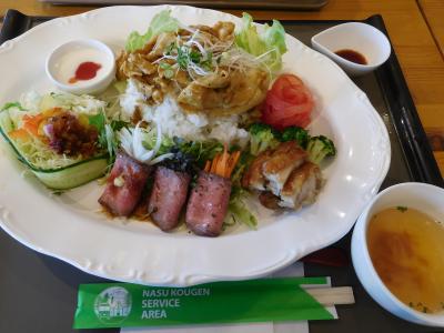 東北自動車道「那須高原SA上り線」施設の右側に、レストランとフードコートが入っています。フードコートには、ラーメンの「麺屋りんどう」、定食・丼の「那須キッチン」、そば・うどんの「高原そば」が入っていて、先に食券を買ってから、各店舗に食券を出してポケベルを受け取るようになっていました。食券売り場の前に、サンプルで置いてあった、新メニューコンテスト出品作品「那須高原プレート」がとても美味しそうだったので、注文しました。ローストビーフの3色巻、カレー味のポークソテー、チキン、トマトの飾り切り、サラダ、温泉卵入りのご飯、と彩どりも良く、いろいろな味が楽しめてとても美味しかったです。フードコートでこのようなクオリティの高いメニューが食べれて良かったです。